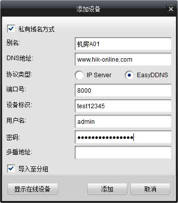 打開iVMS-4200客戶端軟件,進入“設備管理”界面添加設備。選擇私有域名方式添加,協(xié)議類型選擇成海康DDNS,填寫設備域名、用戶名、密碼,即可正常使用iVMS-4200客戶端軟件訪問設備。