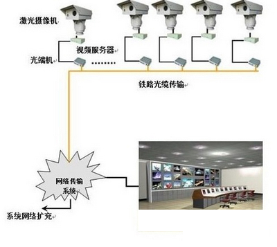 時下,這些設備已在鐵路安防監控系統中發揮實質性的作用,相關方案已用于太原鐵路局(1000余套)、武漢鐵路局宜萬線、廣深鐵路沿線、廣坪鐵路沿線等線路,徹底克服了夜間監控效果差等諸多問題,實現了24小時全天候視頻安全監控??傮w實施方案系統結構示意圖如下圖4所示。